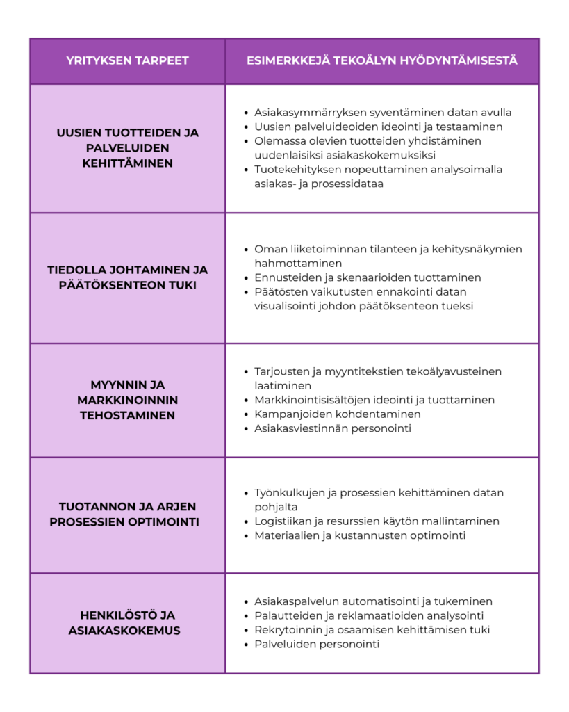 Viereisessä taulukossa on esimerkkejä siitä, mihin pk-yritykset voivat hyödyntää tekoälyä liiketoiminnan eri osa-alueilla.